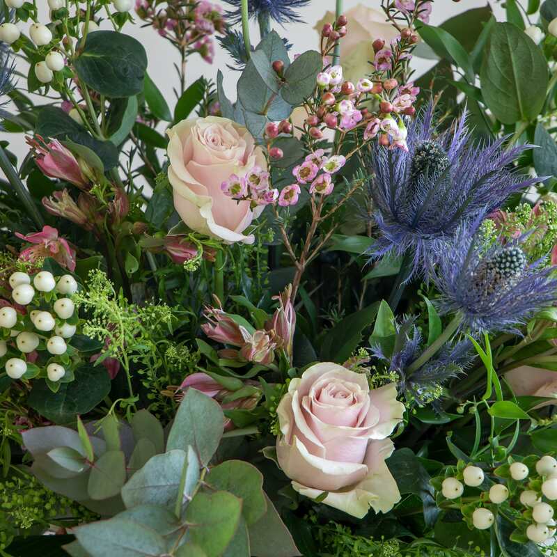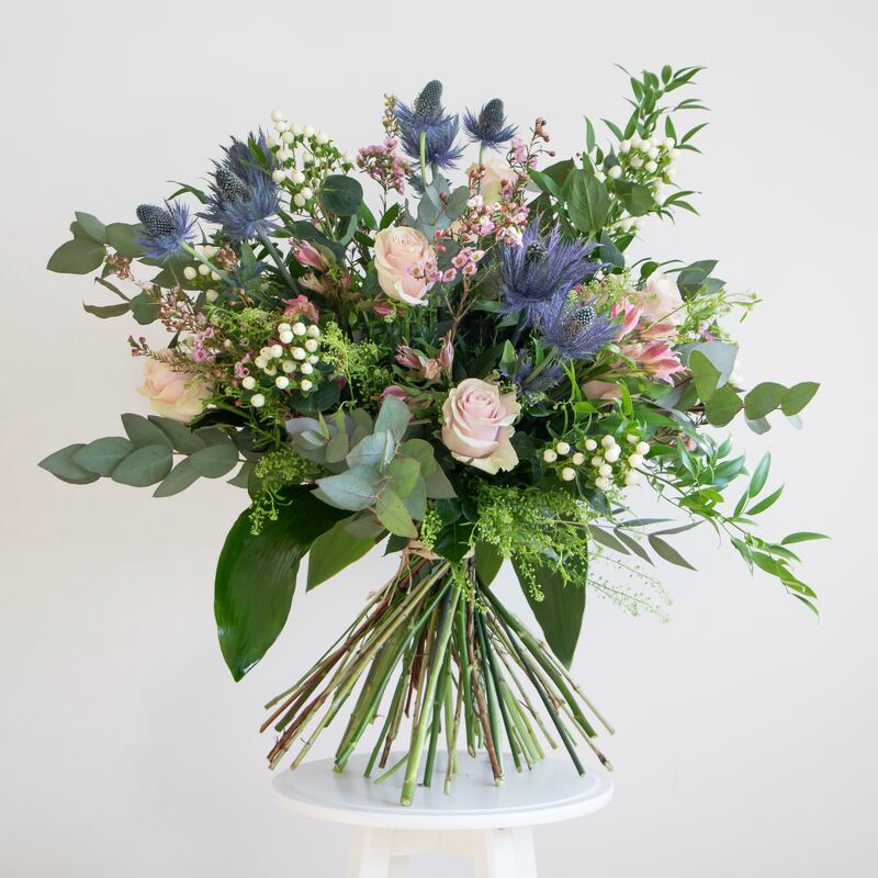 Eissa: An absolutely stunning loose European style bouquet. This favourite with our customers in now available on our webshop for delivery. Filled with roses, eryngium, wax flower, hypericum, ruscus, eucalyptus and alstroemeria this long lasting large bouquet is a perfect bouquet to send to your loved ones or to display in your home.