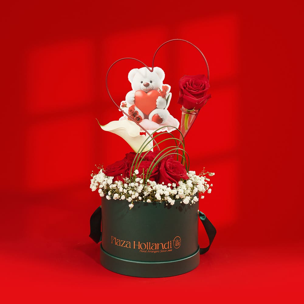 Express your love in the most charming way with our Heart Shape PH Box Arrangement with 10 Red Roses, Gypsophila, Calla Lily & Teddy Bear Tag.