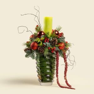 - Flowers: Fresh, vibrant red roses paired with the lush greenery of Italian ruscus, creating a harmonious balance of color and texture.