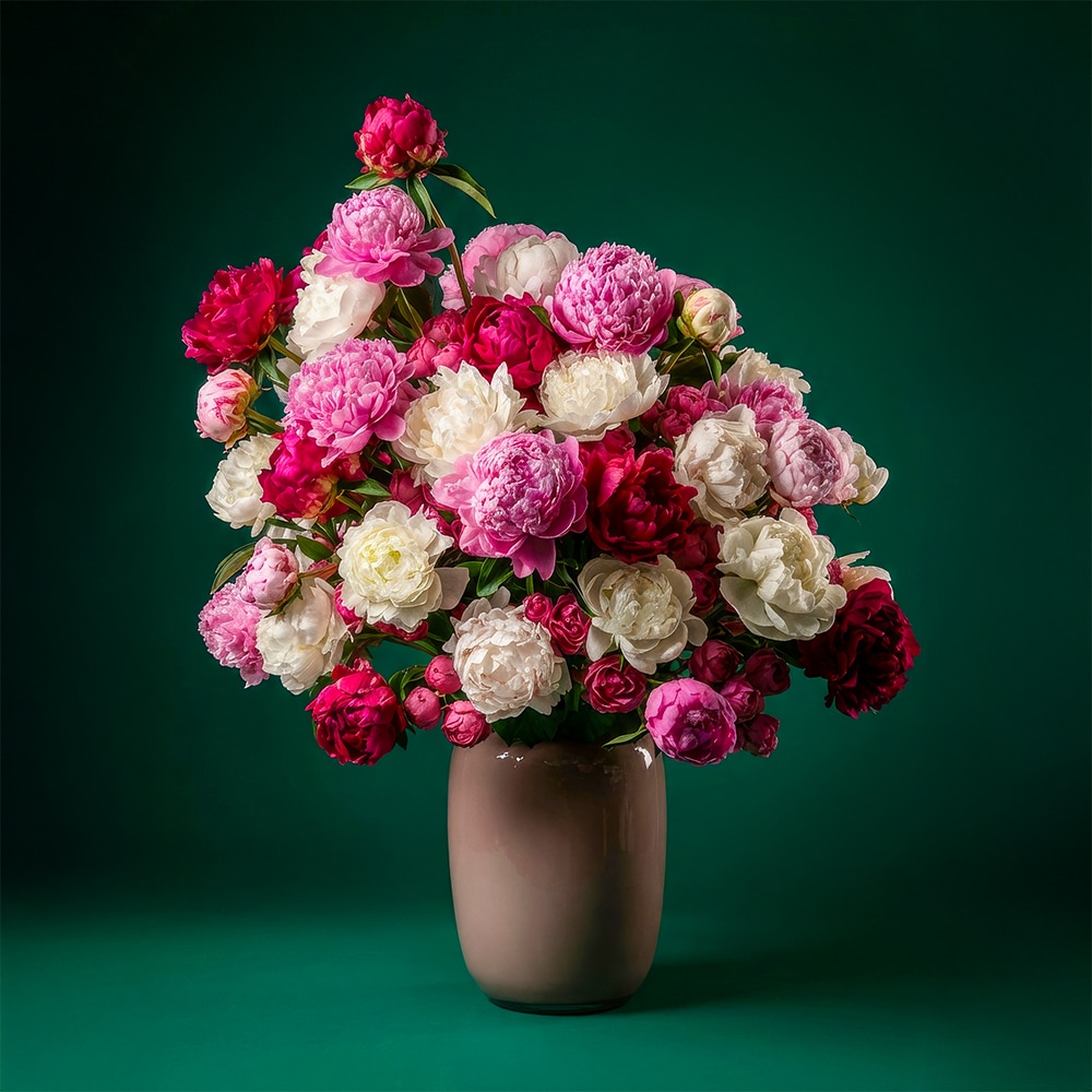 An elegant floral arrangement featuring fresh peonies and delicate spray roses, beautifully styled in a luxury glass vase. Perfect for sophisticated gifting and refined home décor.