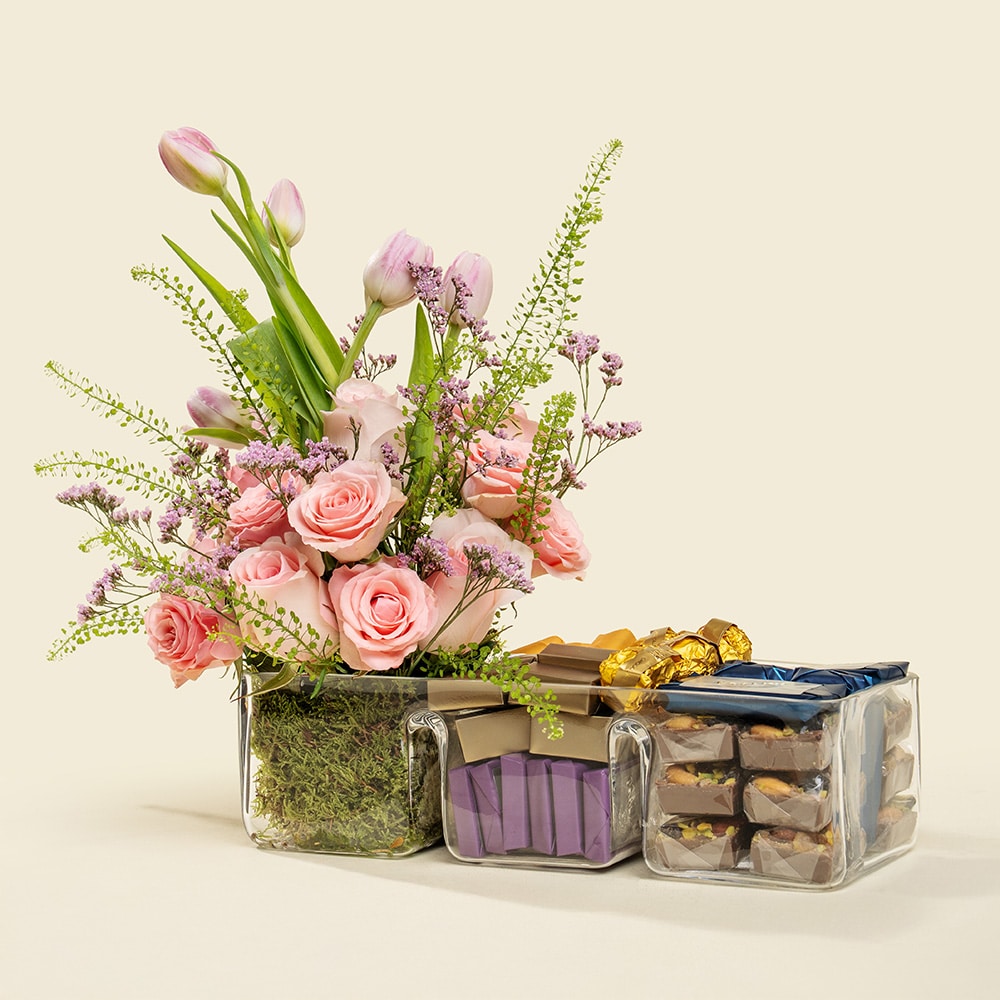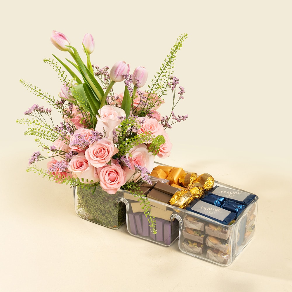 Baby Roses, Pink Roses & Tulips Bouquet (20cm) with 1Kg Praline Chocolates